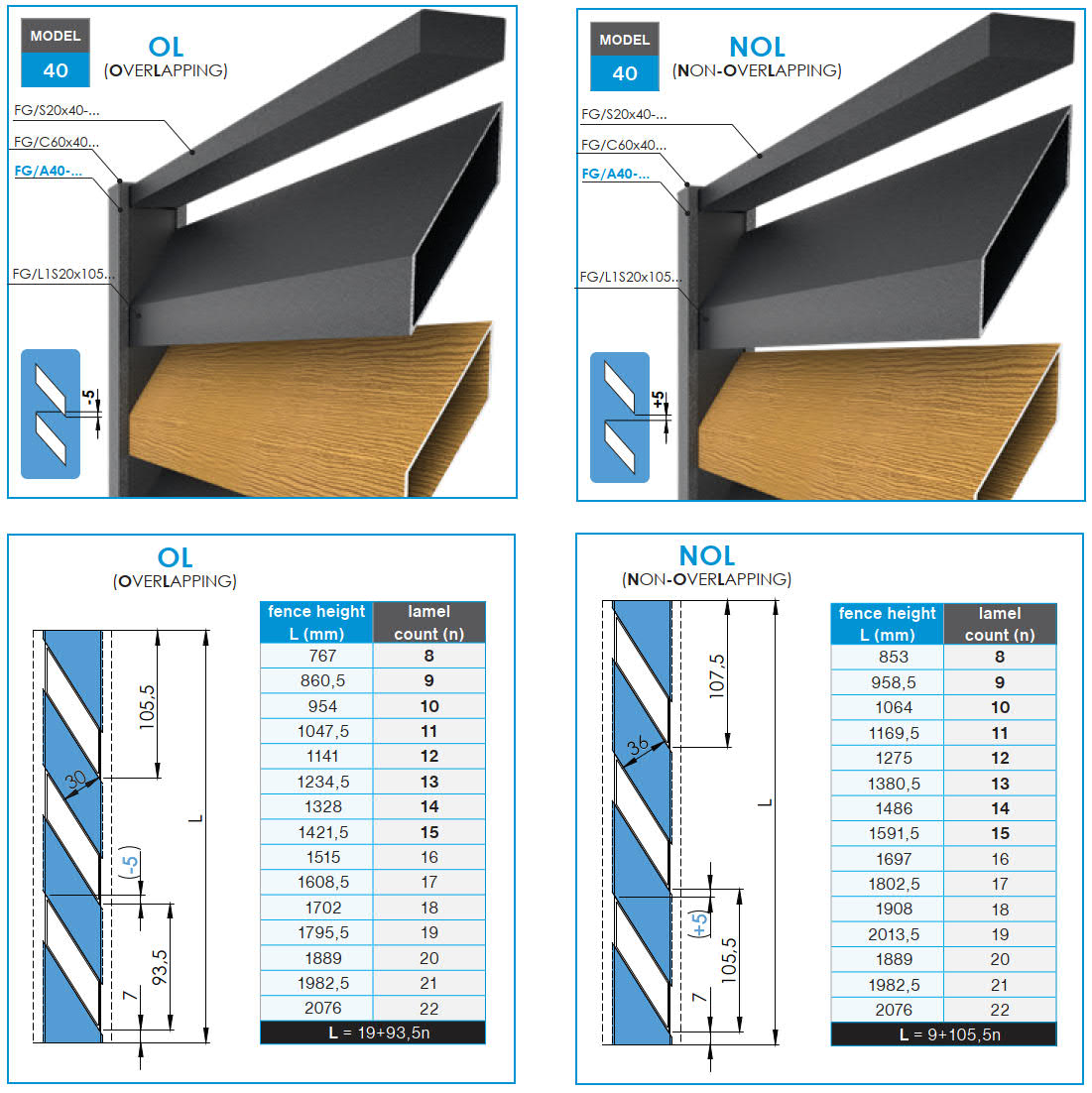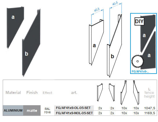 Complete set of inclined distance covering strips for the MOUNT L2 system. With this set, you can assemble a fence panel with a maximum height of 1047.5 mm. The slats are installed with a 5 mm overlap, making the fence panel opaque.
