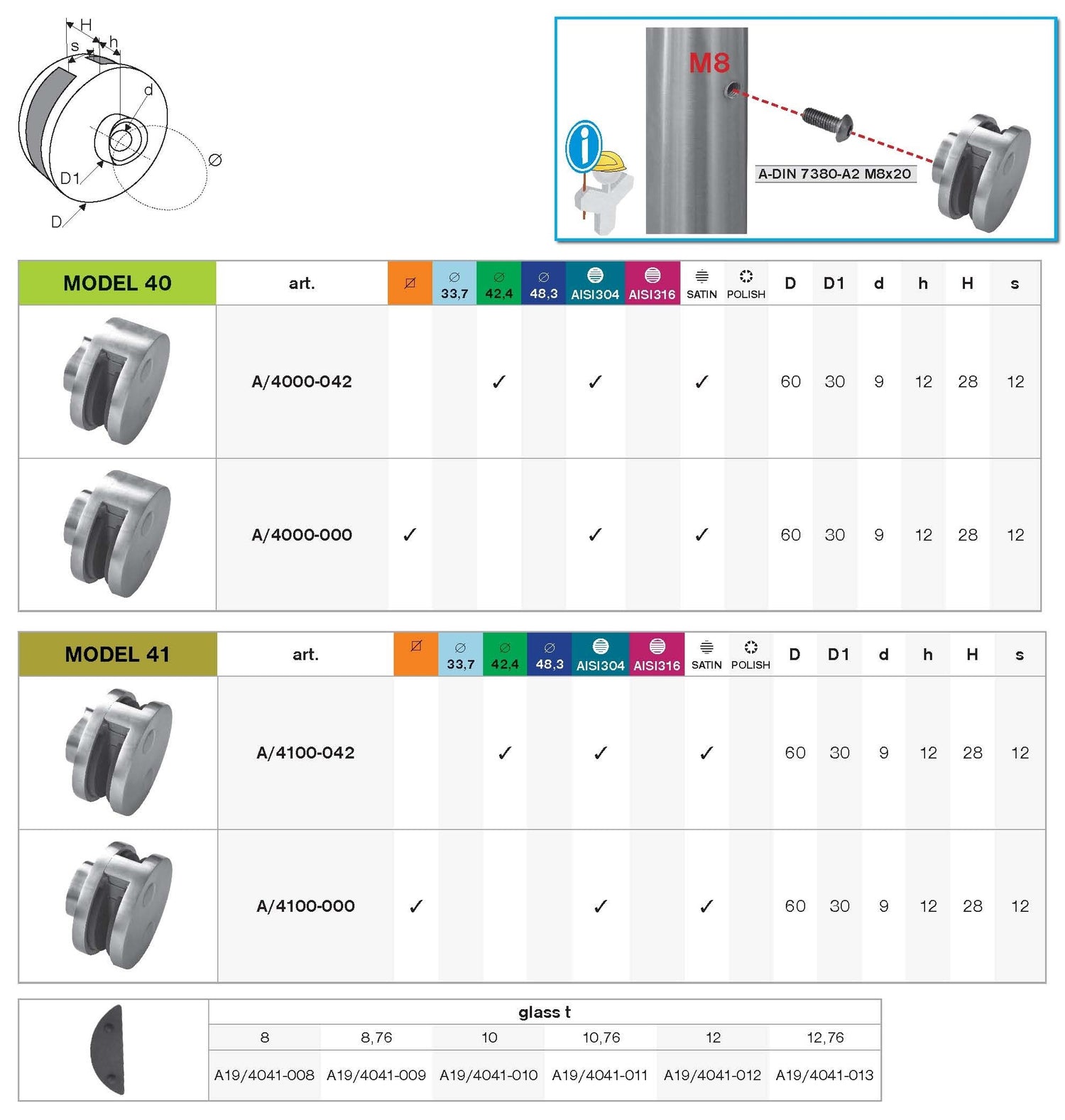 Materiał: Stal nierdzewna AISI 304, Wykończenie powierzchni: Szlifowany, Wypełnienie: Szkło, szkło t: 8/8,76/10/10,76/11,52/12/12,76, Słupek: D42,4, Model: Model 40, 41