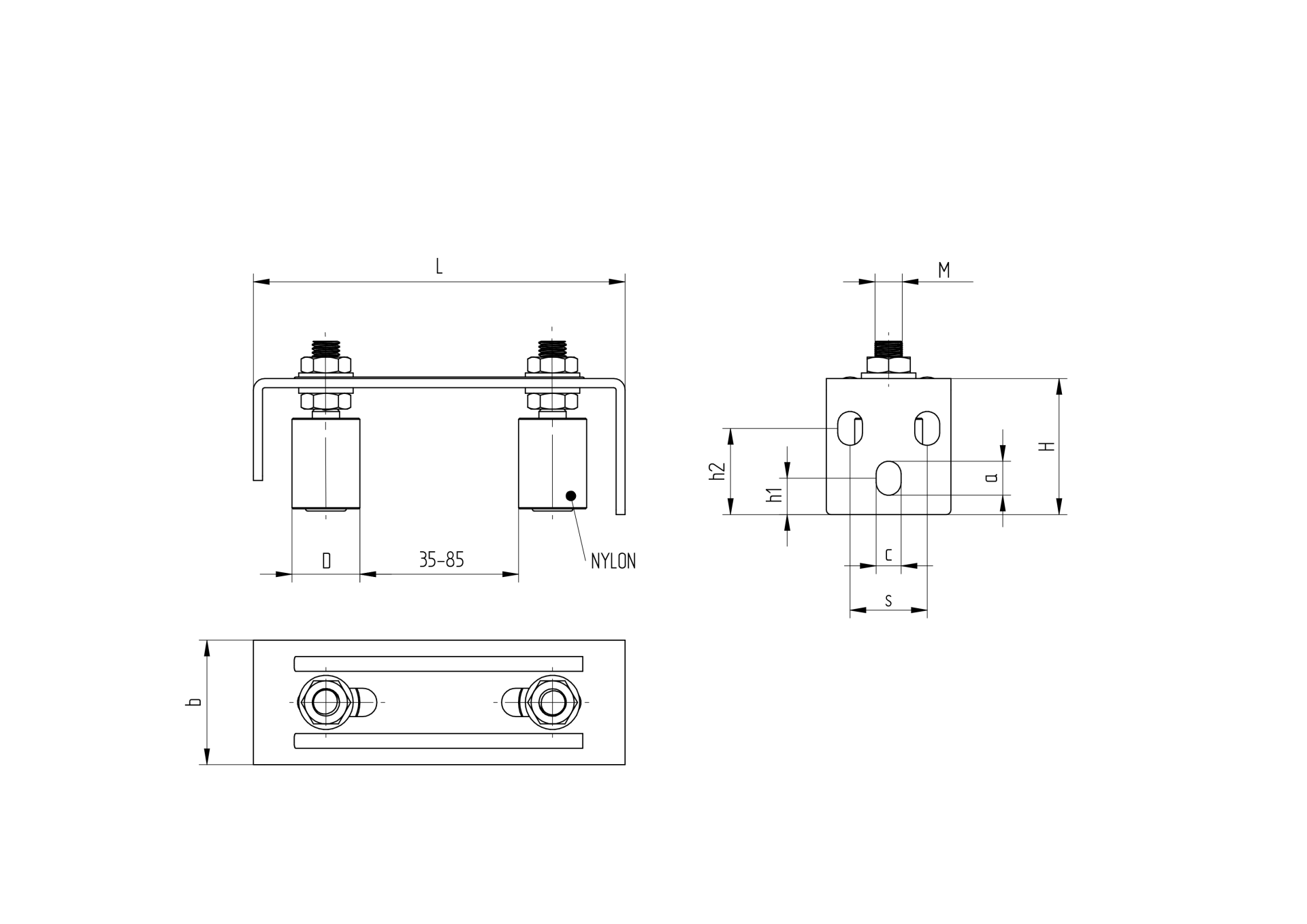 Materiał: Stal nierdzewna AISI 304, Wykończenie powierzchni: Surowy, L: 164, M: 12, s: 34, a: 15, b: 57, c: 11, D: 30, H: 60, h1: 14, h2: 36