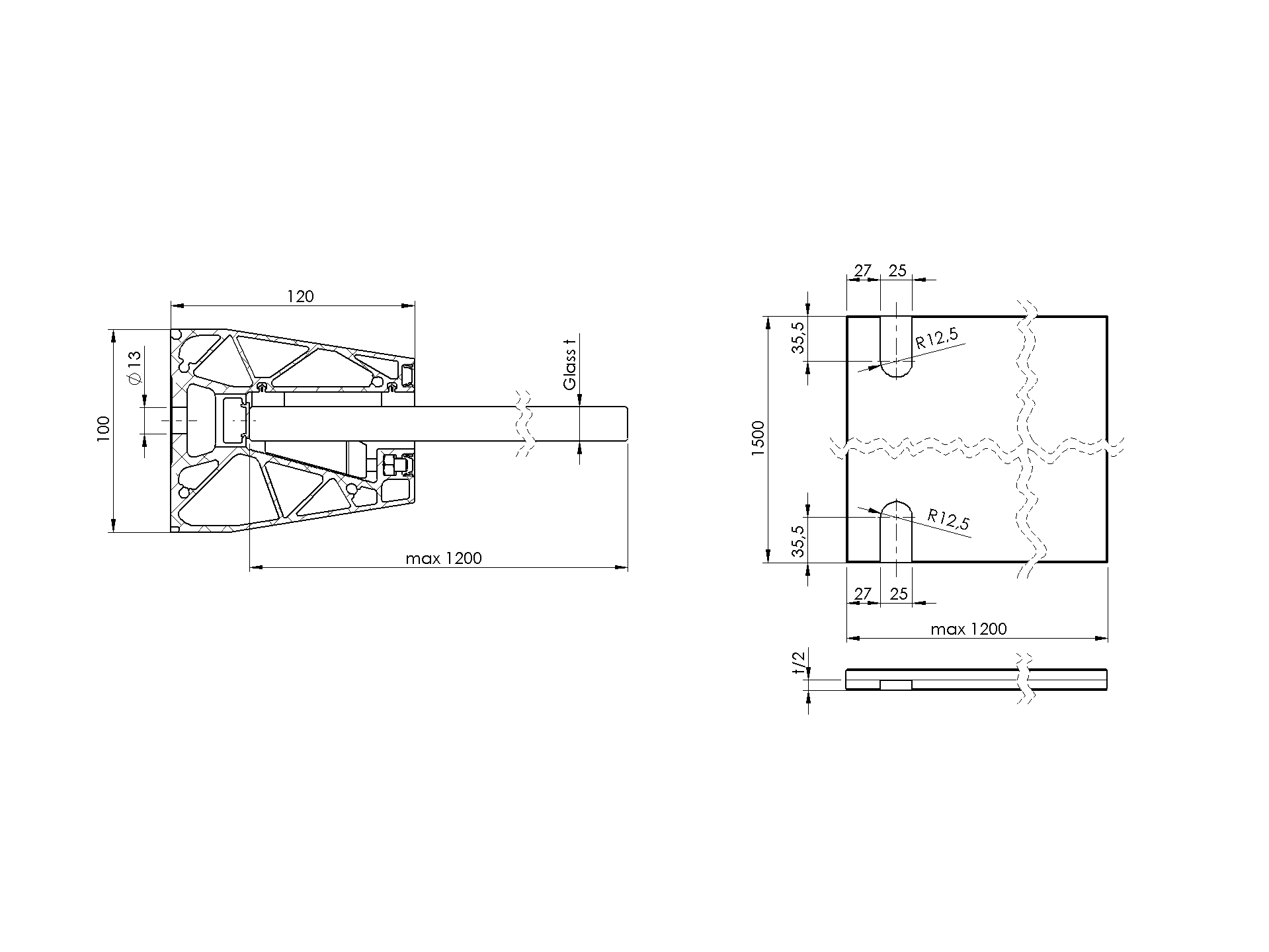 Materiał: Aluminium/EPDM/Plastik, Wykończenie powierzchni: Lakierowanie proszkowe, szkło t: 12,76-13,52/16,76-17,52/20,76-21,52, Kolor: Antracit RAL7016, L: 1500, Quality: VSG/TVG, G/h kN: 1,5